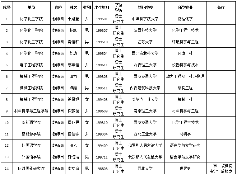 按照学校博士招聘工作安排,经院(系)对应聘人员的基本条件、思想品德以及业务能力的综合考核,学校审定,我校拟选聘下列人员来校工作。本着公平、公正、公开的原则,现将拟选聘人员的基本情况公示如下: